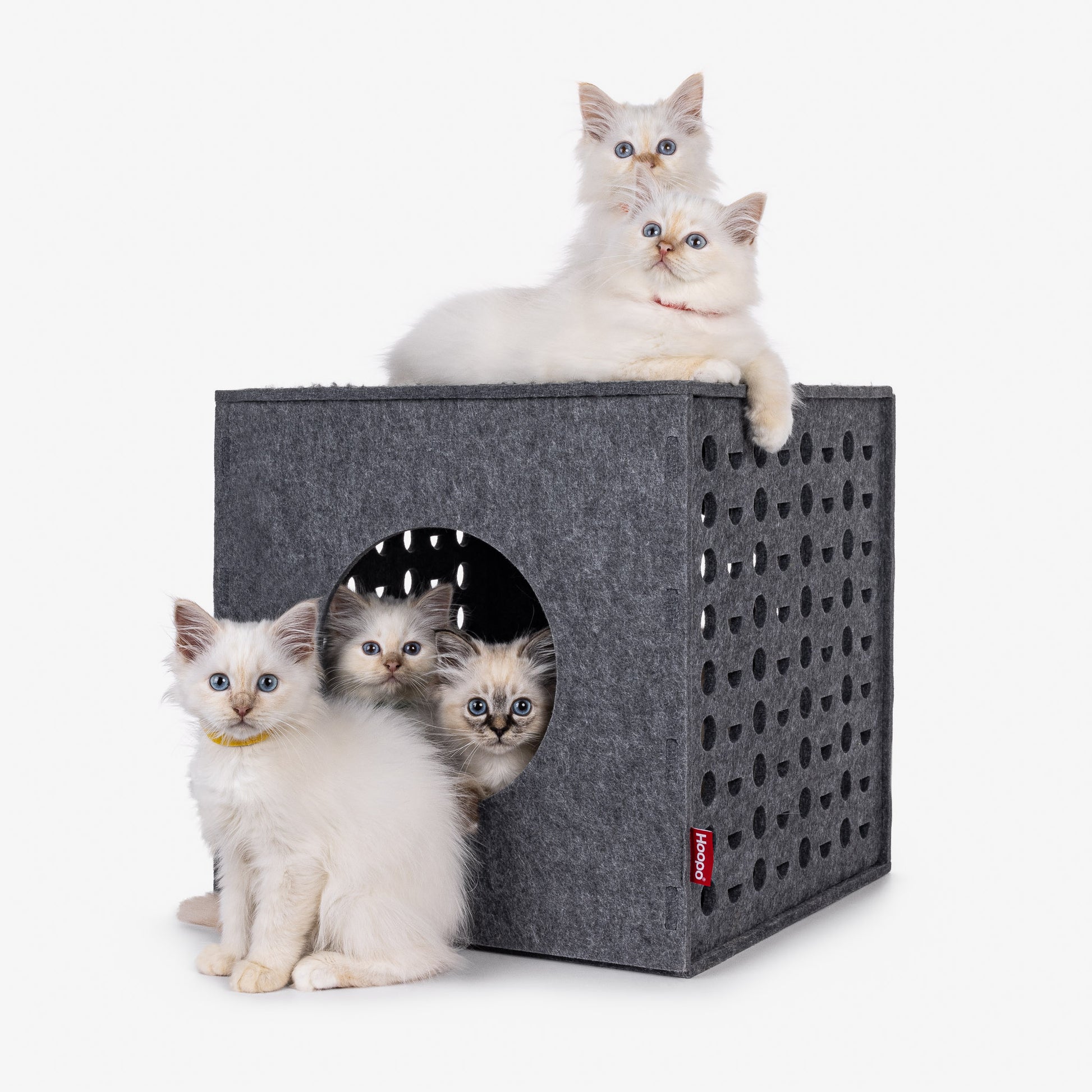 Der Cube bietet Ihrer Katze das ultimative Spielparadies und Ihnen eine schöne Ergänzung für Ihr Zuhause. Dieser stilvolle, leichte Spielwürfel aus Filz ist mehr als nur ein Spielzeug. Er bietet Ihrer Katze ein sicheres Versteck und lädt dank der strategisch platzierten Gucklöcher zu spannenden Jagdspielen ein. So fühlt sich Ihre Katze immer sicher und hat die Kontrolle, so wie es die Natur vorgesehen hat. Der Cube lässt sich mit den praktischen Druckstreifen leicht zusammenbauen und ebenso leicht aufbewahren.