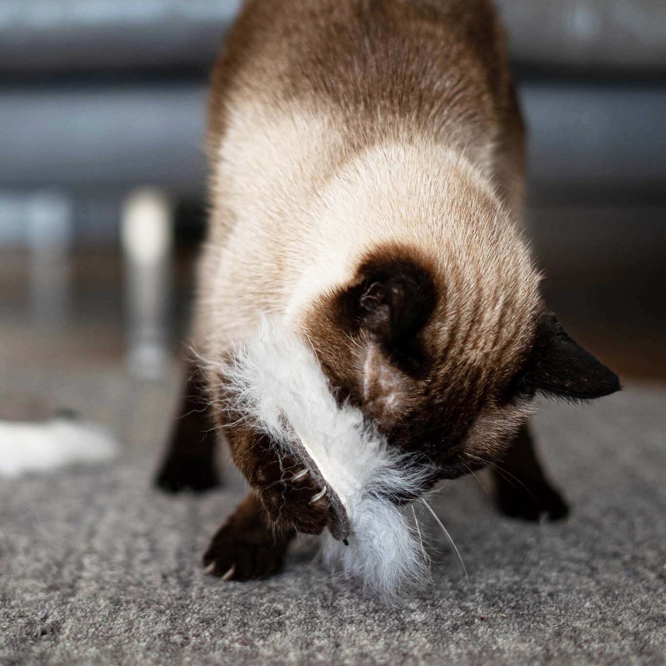 Alle purrmania-Spielzeuge werden mit großer Sorgfalt und viel Liebe in unserer Berliner Manufaktur von Hand gefertigt. Die hohe Qualität bei Material und Verarbeitung ist unsere Verantwortung, deine ist es, deine Katze nicht unbeaufsichtigt damit spielen zu lassen – gemeinsam Spielen ist ohnehin viel schöner und stärkt die Bindung zwischen Mensch und Tier. Für einige wenige Katzen ist unser Spielzeug so sehr "echte Beute", dass sie alles daran setzen, dieses zu zerlegen. Natürlich sind Katzen rein körperlich dazu in der Lage, eine Beute komplett auseinander zu nehmen wenn sie es wollen. Bitte unterscheide, ob deine Katze ein Spielverhalten zeigt oder im "Zerstörungs- und Beuterausch" ist. Bei letzterem empfehlen wir, das Spielzeug gegen einen Leckerbissen einzutauschen und erst am nächsten Tag wieder zur Verfügung zu stellen. Sollte sich ein Teil des Spielzeugs lösen, schneide es bitte ab. Defekte Spielzeuge bitte ersetzen.