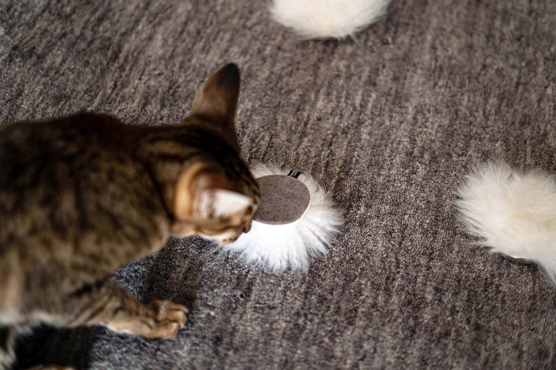 Das fluffige Teil besteht aus echtem Schaffell und Wollfilz aus 100% Schafschurwolle. Als ob das noch nicht toll genug wäre, hat mr. fluff sich auch noch gewaltig den Bauch voll geschlagen: Mit feinsten Bio-Baldrianwurzelstücken. mr. fluff ist für Katzennasen* ein echter Hochgenuss, denn es riecht nicht nur köstlich nach echtem Fell und Wolle, sondern auch nach fein-stinkigem Baldrian. Von oben betrachtet wirkt mr. fluff wie ein Flauschmonster. Durch die Filzunterseite ist es aber besonders griffig für Katzenkrallen und kann zudem toll über glatte Böden schlittern.