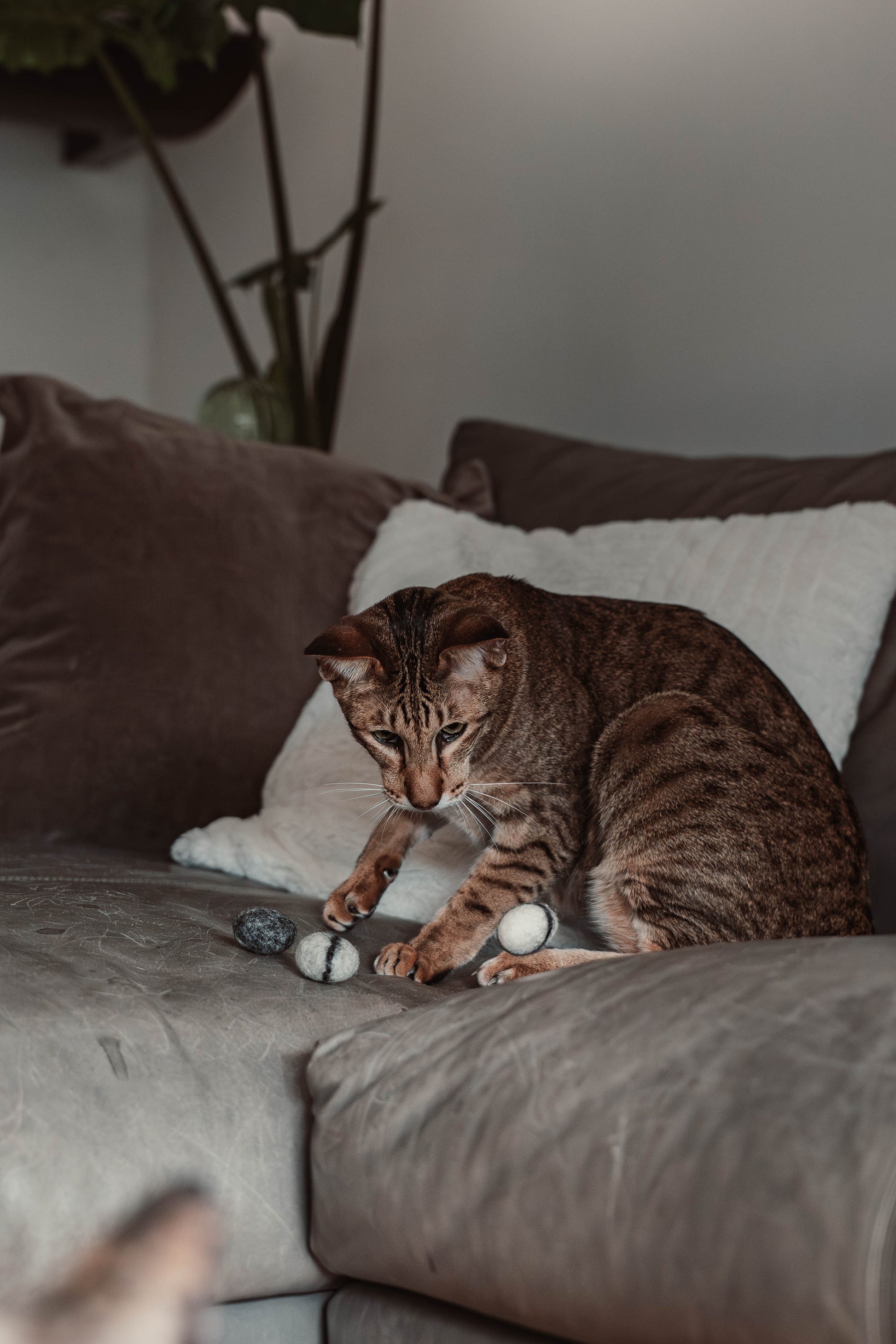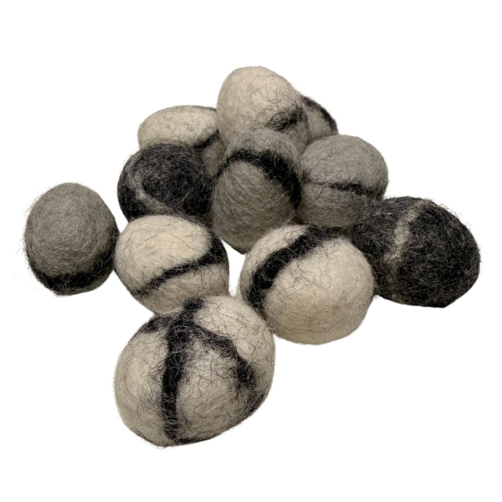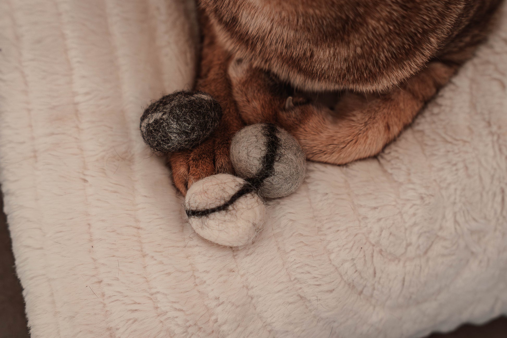 So schön wie ein Bällchen - aber irgendwie "unrund" kullern die Filzkiesel auch mal etwas anders als geplant. Sie lassen sich super werfen, apportieren und sind so schnell unter dem Sofa, dass man am besten gleich mehr als einen bestellt...