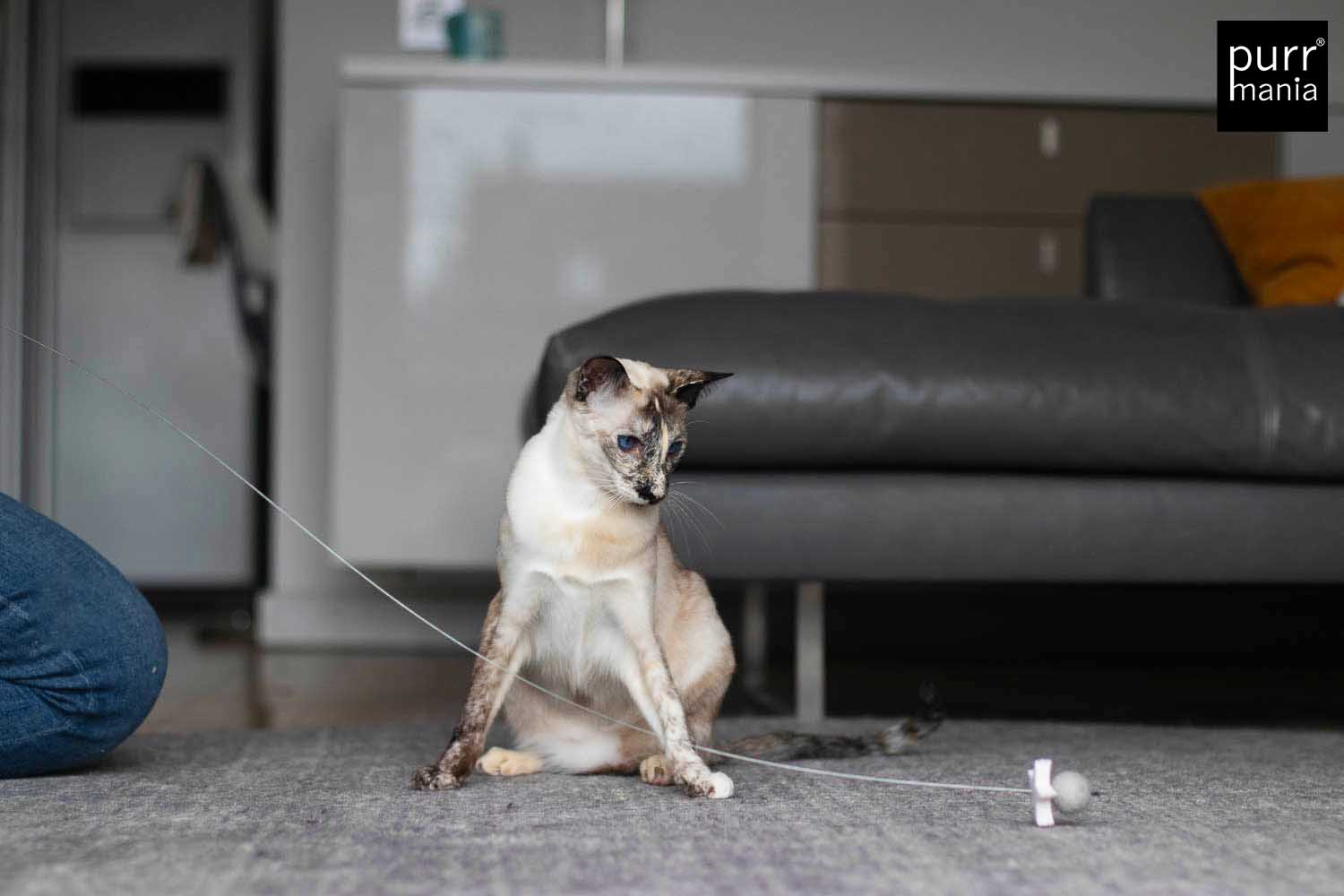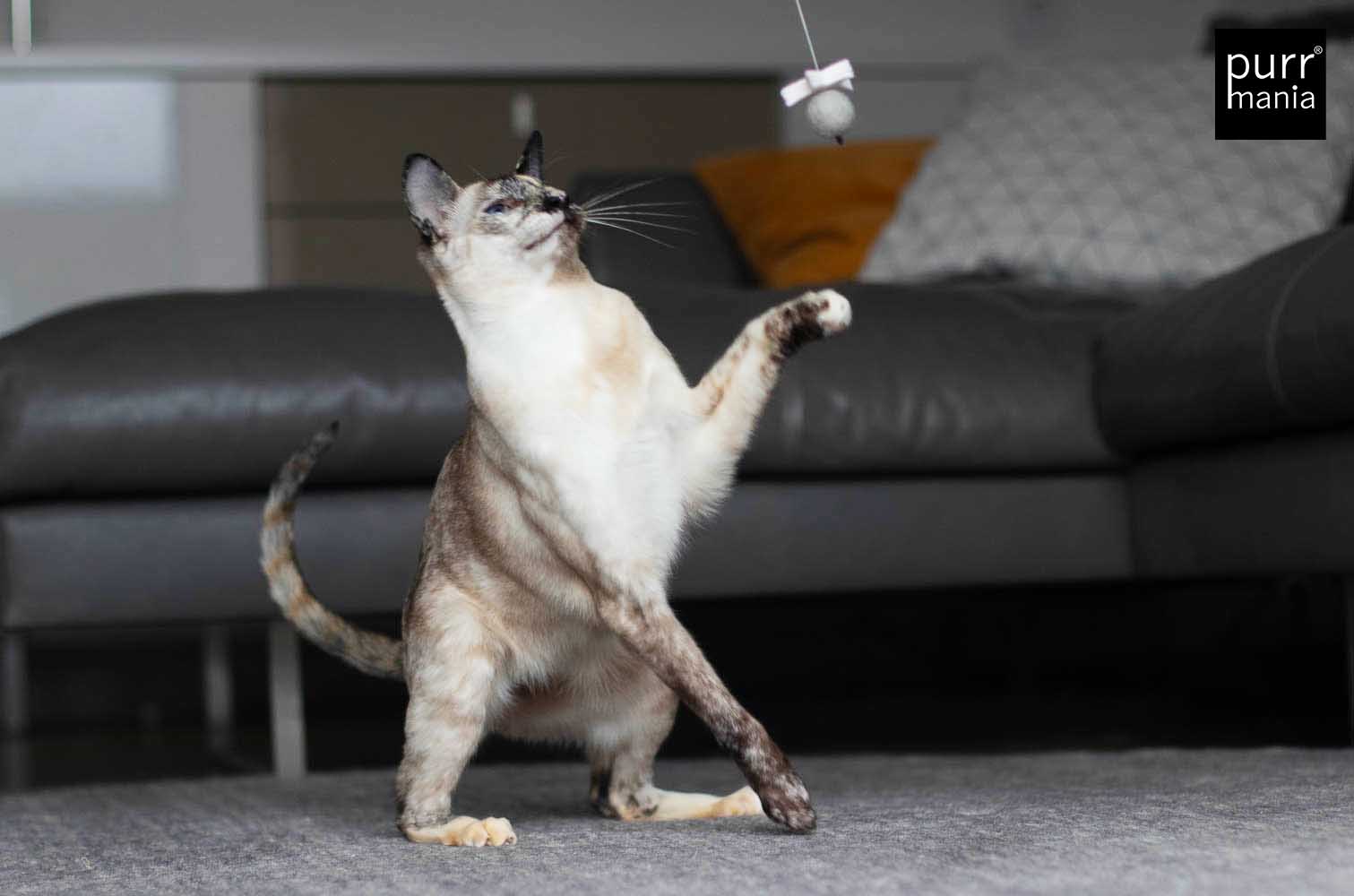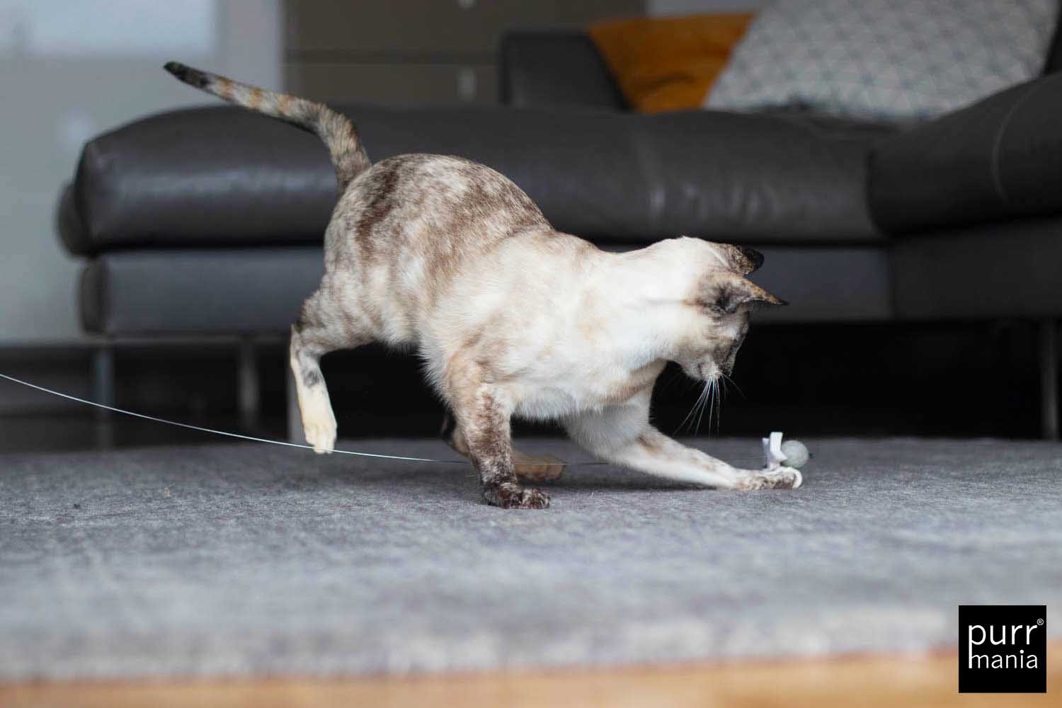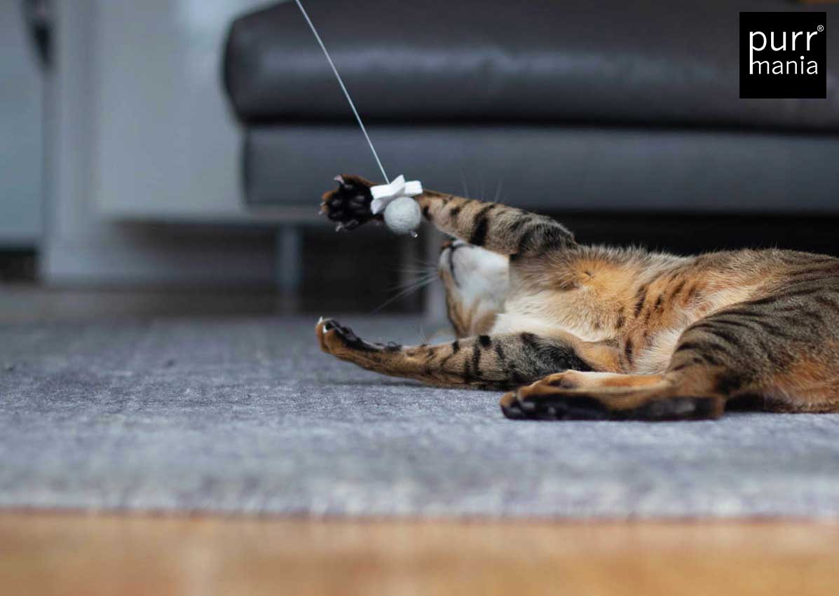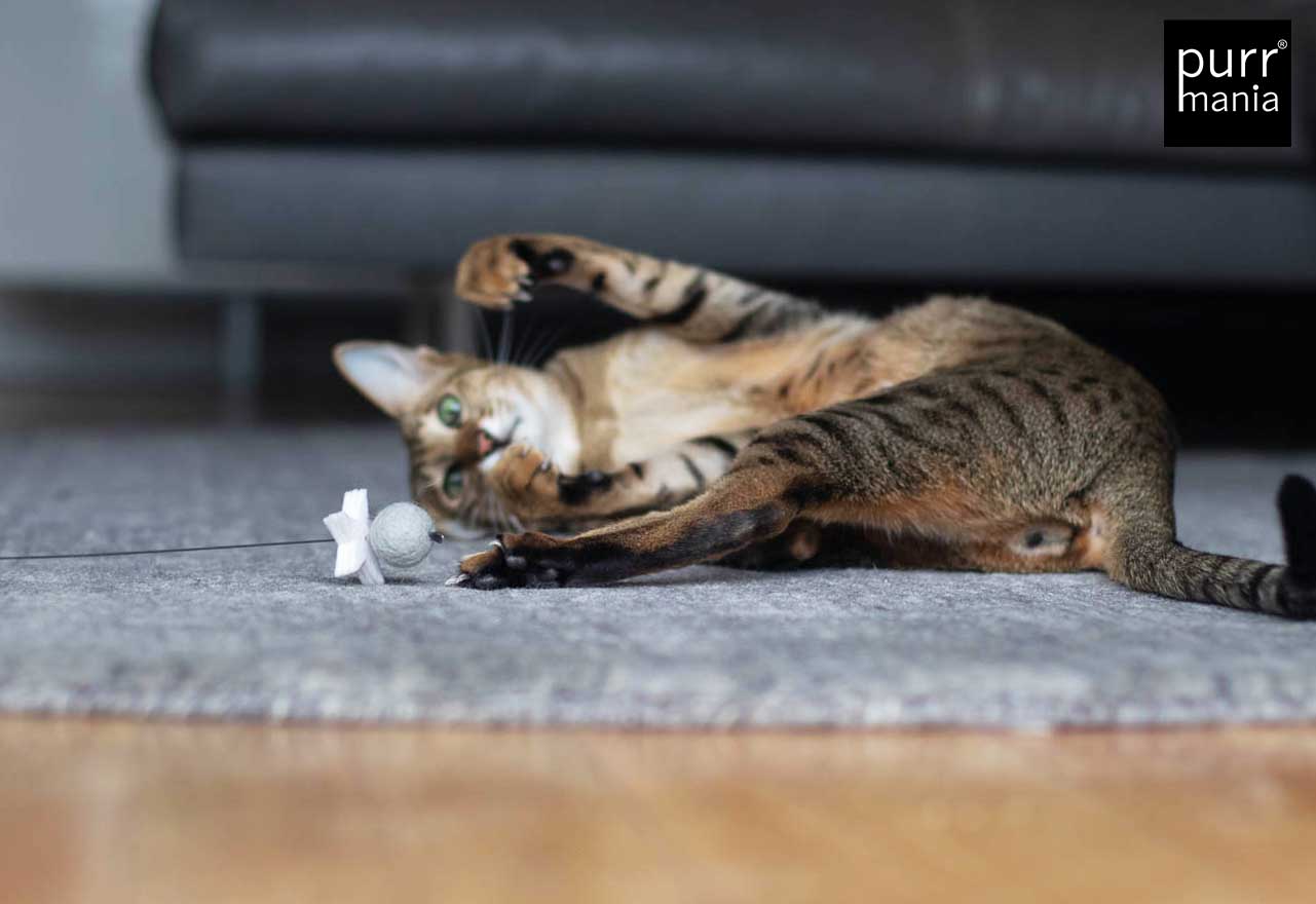 Nicht für Kinder geeignet! Nur zur Nutzung durch Haustiere.Tiere nie unbeaufsichtigt mit dem Spielzeug lassen.Beschädigtes Spielzeug nicht mehr weiter benutzen.Bei versehentlich verschluckten Teilen einen Tierarzt aufsuchen.Alle purrmania-Spielzeuge werden mit großer Sorgfalt und viel Liebe in unserer Berliner Manufaktur von Hand gefertigt. Die hohe Qualität bei Material und Verarbeitung ist unsere Verantwortung, deine ist es, deine Katze nicht unbeaufsichtigt damit spielen zu lassen – gemeinsam Spielen ist ohnehin viel schöner und stärkt die Bindung zwischen Mensch und Tier. Für einige wenige Katzen ist unser Spielzeug so sehr "echte Beute", dass sie alles daran setzen, dieses zu zerlegen. Natürlich sind Katzen rein körperlich dazu in der Lage, eine Beute komplett auseinander zu nehmen wenn sie es wollen. Bitte unterscheide, ob deine Katze ein Spielverhalten zeigt oder im "Zerstörungs- und Beuterausch" ist. Bei letzterem empfehlen wir, das Spielzeug gegen einen Leckerbissen einzutauschen und erst am nächsten Tag wieder zur Verfügung zu stellen. Sollte sich ein Teil des Spielzeugs lösen, schneide es bitte ab. Defekte Spielzeuge bitte ersetzen.
